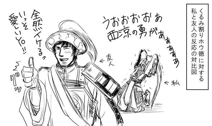 呂布軍は他の勢力と違って、国が欲しいわけでもなく、呂布の望みも「俺より強い奴に会いに行く」的なごくごく私的なものっぽい浪人集団(ただし腕っ節は超一流)なイメージなんだけど、集団として特にこれといった目的もなくなんだかフワッとした感覚で一緒にいるのが凄くツボ。それぞれがそれぞれなりの理由で呂布について行ってはいるんだろうけど、全体目標が定まってないのがね、それなのに一軍勢として成り立っているのがね、ほんんまたまらん。覇道とか王道とかそういう大将の掲げる理想にではなく、呂奉先そのものに皆ついて行ってる感じが、集団としてはとても危うくて魅力的だなと思うわけですよ。