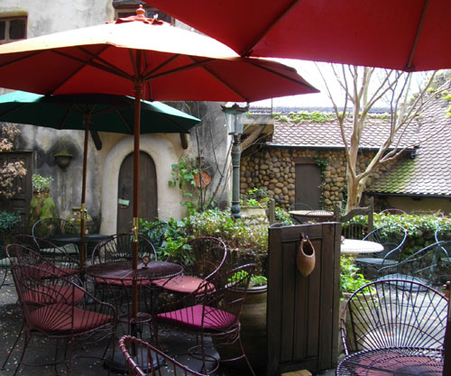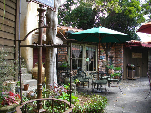 奥のガラスの扉がケーキ屋さん。そこで買ったケーキは外のテーブルで食べられます。